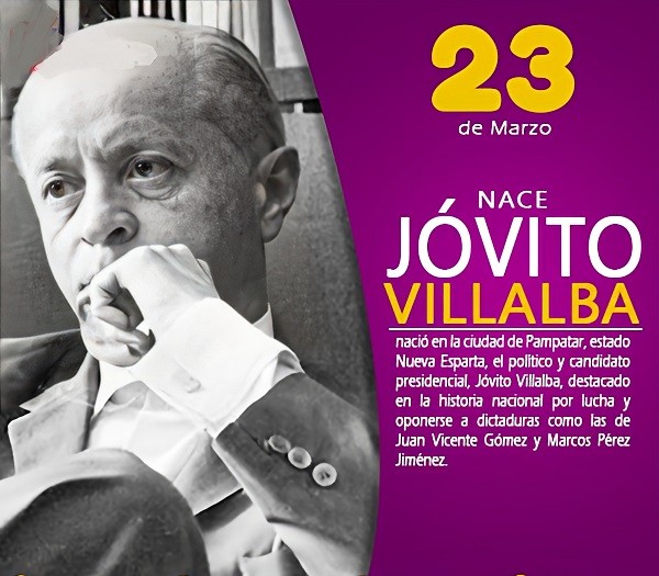 1908: Nace en Pampatar, Estado Nueva Esparta Jóvito Villalba, líder estudiantil de la generación del 28, firmante del pacto de punto Fijo.