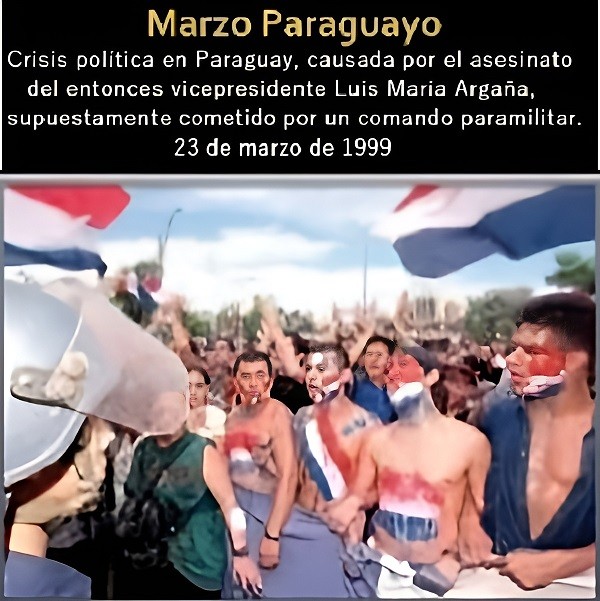 1999: En Asunción, Paraguay, tres individuos con traje militar matan a tiros al vicepresidente paraguayo, Luis María Argaña, principal adversario político del presidente Raúl Cubas. Se sucede la crisis política conocida como Marzo Paraguayo.