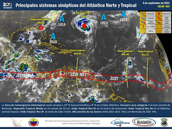 En su reporte, Inameh detalla que la Onda Tropical número 45, en su desplazamiento del centro al occidente del país, favorece la formación de nubes de mediano y gran desarrollo vertical, precipitaciones y descargas eléctricas, en áreas de Centro Norte Costero, Sucre, Monagas y Delta Amacuro; estimándose máximos pluviométricos entre 5-50 l / m².