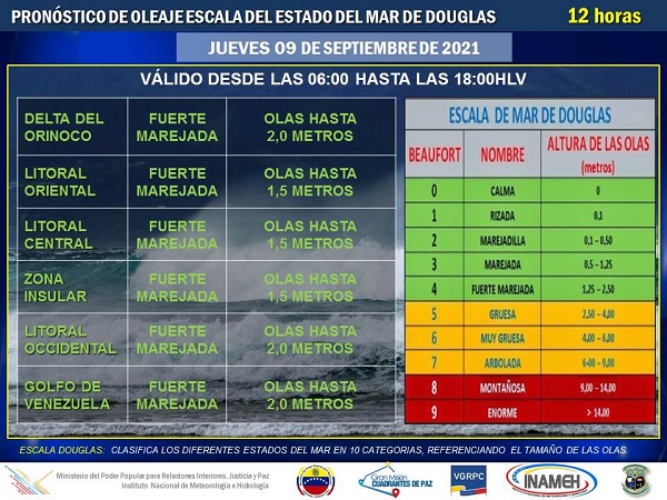 Con respecto al estado del mar, se espera Fuerte Marejada con olas hasta 2.0 m de altura en el golfo de Venezuela, costas occidentales y delta del Orinoco; olas hasta 1.5 m en zona Insular, costas Centrales y Orientales.
