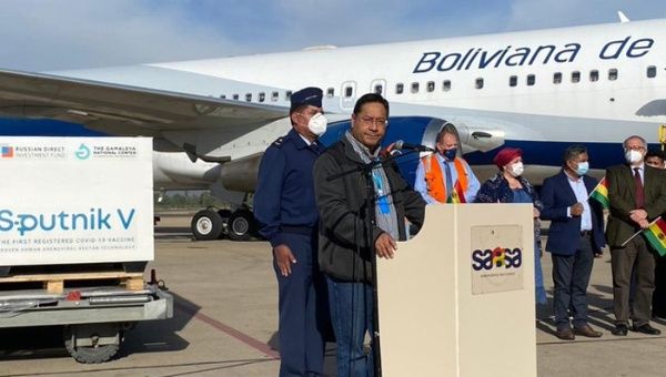 El presidente de Bolivia, Luis Arce, recibió la mañana de este sábado 400.000 dosis de la vacuna rusa Sputnik V en el aeropuerto Jorge Wilstermann de Cochabamba, donde participó el embajador de Rusia, Mikhail Nikolaevich.