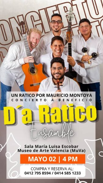 - Un Ratico por Mauricio Montoya · Concierto de D’a Ratico Ensamble a Beneficio – Sala María Luisa Escobar del MUVA – 4:00 pm