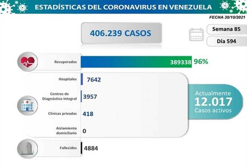 Un total de 794 nuevos casos de COVID-19, Carabobo lidera la lista con 184 en las últimas 24 horas, identificadas por las autoridades sanitarias venezolanas, 792 por transmisión comunitaria y 2 importados, elevando a 406.239 el total acumulado de contagios, mientras que la tasa de recuperados es de 96% , al sumar 389.388 pacientes sanados gracias a los tratamientos gratuitos que garantiza el Gobierno Bolivariano.