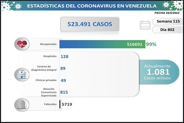 En la publicación precisó que hasta la fecha se han registrado 523.491 casos en lo que va de pandemia, 516.691 (99%) personas recuperadas, 1.081 casos activos actuales y 5.719 de fallecidos.