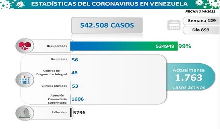 Estos números elevan a 542 mil el acumulado confirmado, mil 763 casos activos, mientras que la cifra de recuperados se ubica en 534 mil 949 pacientes, gracias a los tratamientos gratuitos que garantiza el Gobierno Bolivariano.
