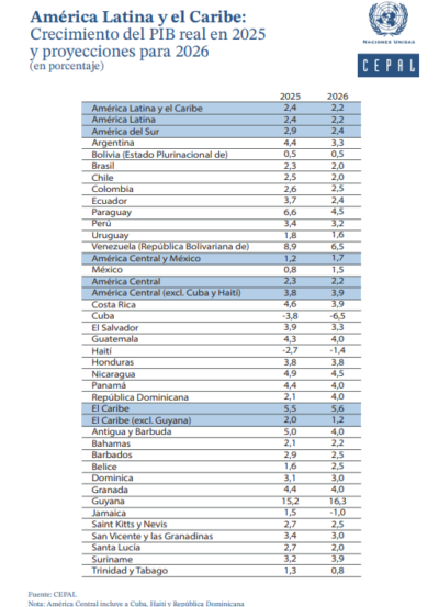 Venezuela proyecta un crecimiento de su Producto Interno Bruto (PIB) de 6,5 por ciento para el año 2026, siendo unos de los países con los índices más altos de la región, de acuerdo con el último estudio realizado por la Comisión Económica para América Latina y el Caribe (Cepal).
