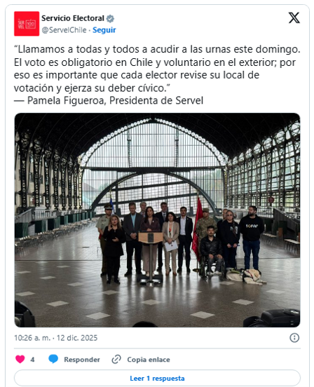 “El voto es obligatorio en Chile y voluntario en el exterior; por eso es importante que cada elector revise su local de votación y ejerza su deber cívico”, manifestó la funcionaria.