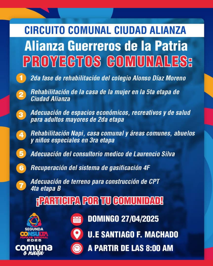 Este domingo 27 de abril, el pueblo venezolano está llamado a participar en un evento trascendental para el desarrollo comunal: la Segunda Consulta Popular Nacional del año 2025.