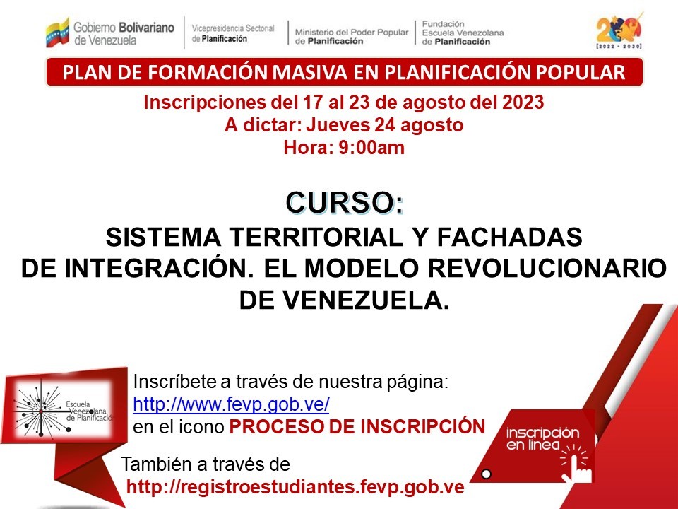 También a través de la página http://registroestudiantes.fevp.gob.ve estará abierto el registro a la formación en sistema territorial de integración.