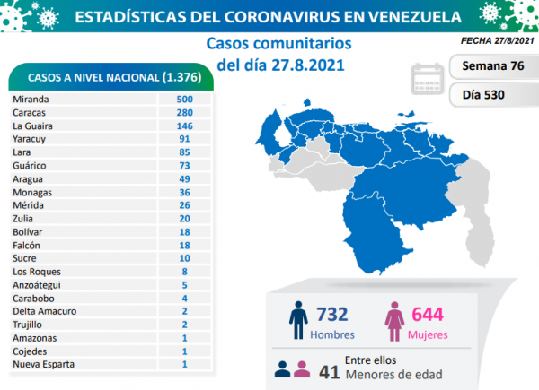 Informó que los casos comunitarios de la jornada se detectaron en 21 estados: Miranda (500), Caracas (280), La Guaira (146), Yaracuy (91), Lara (85), Guárico (73), Aragua (49), Monagas (36), Mérida (26), Zulia (20), Bolívar (18), Falcón (18), Sucre (10), Los Roques (8), Anzoátegui (5), Carabobo (4), Delta Amacuro (2), Trujillo (2), Amazonas (1), Cojedes (1), Nueva Esparta (1)