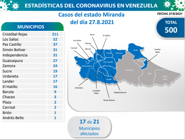 La entidad con mayor cantidad de contagios en la jornada es Miranda, con nuevos casos activos en 17 de sus 21 municipios: Cristóbal Rojas (211), Los Salias (52), Paz Castillo (37), Simón Bolívar (31), Independencia (31), Guaicaipuro (27), Zamora (24), Sucre (19), Urdaneta (17), Lander (17), El Hatillo (16), Baruta (9), Chacao (3), Plaza (2), Carrizal (2), Brión (1), Andrés Bello (1).