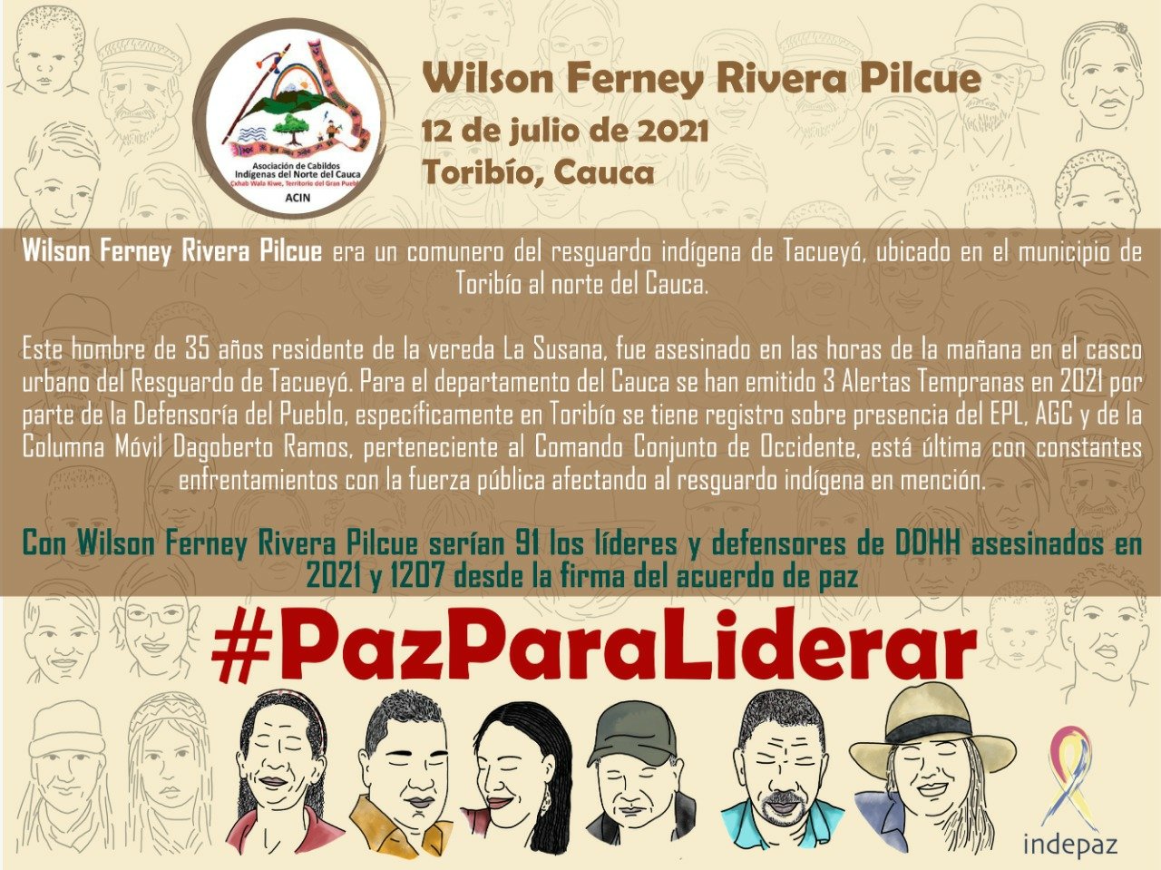 De acuerdo a Indepaz, la víctima respondía al nombre de Wilson Ferney Rivera y hacía parte del resguardo indígena de Tacueyó, localizado en Toribío, «fue asesinado en el casco urbano del municipio», agrega el Instituto.