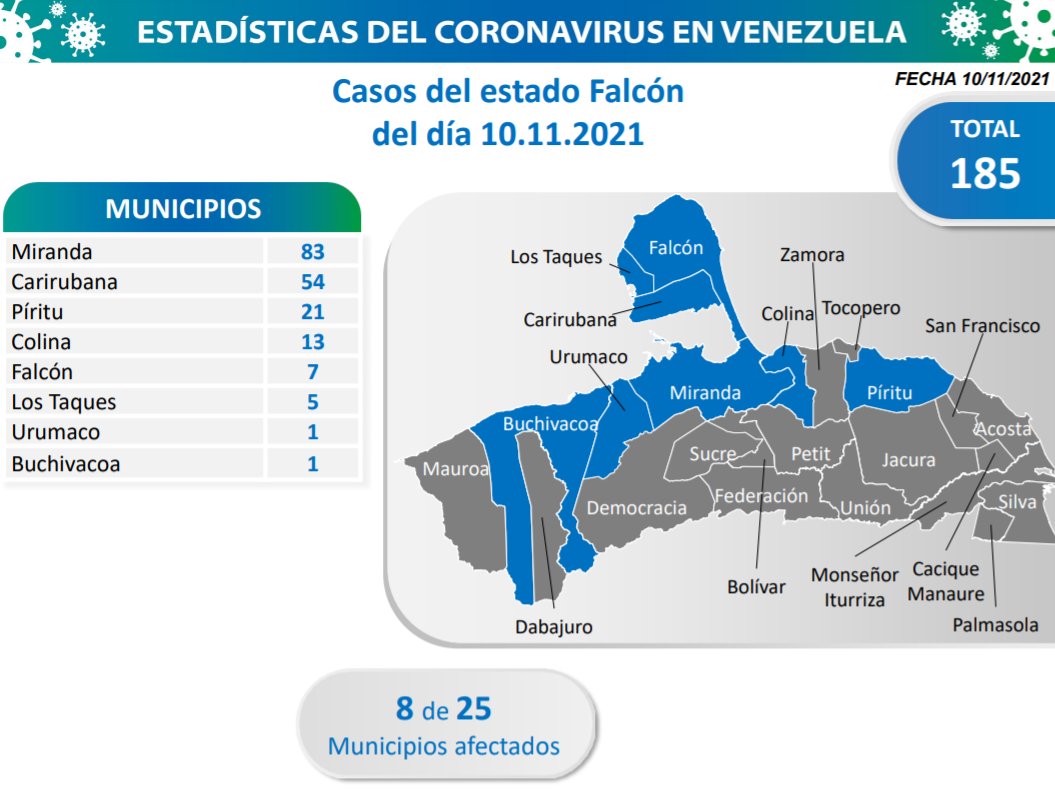 Falcón presenta hoy el mayor número de contagios en 8 de sus 25 municipios: Miranda 83, Carirubana 54, Píritu 21, Colina 13, Falcón 7.