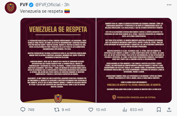 La Federación Venezolana de Fútbol condena enérgicamente las agresiones, tanto verbales como físicas, así como los actos de discriminación y xenofobia sufridos ayer por nuestro equipo y nuestra afición, durante el partido celebrado en Lima, entre las selecciones de Perú y Venezuela en la sexta fecha de las eliminatorias suramericanas Copa Mundial Fifa 2026.