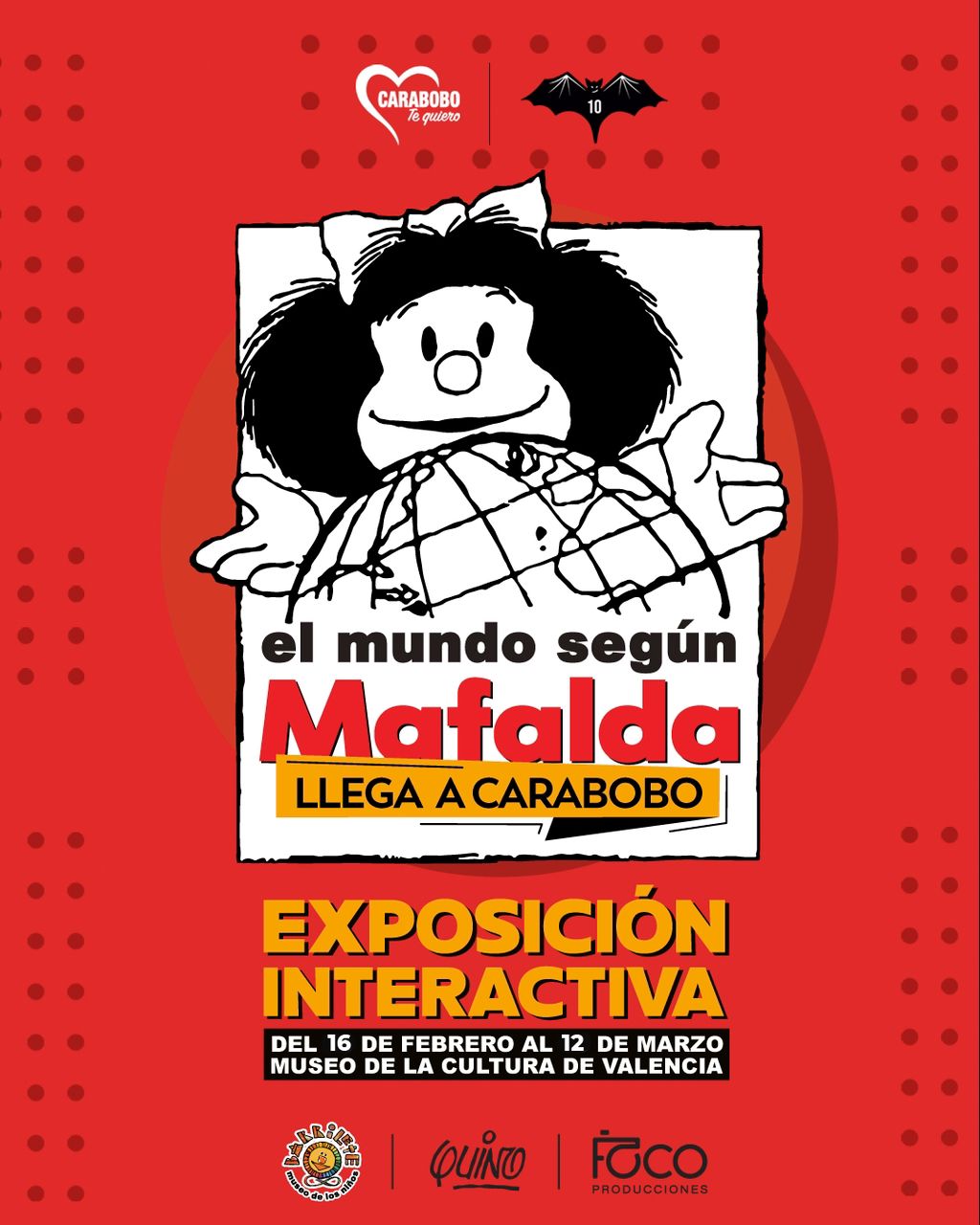 El gobernador del estado Carabobo, Rafael Lacava, a través de su cuenta en Instagram @lacava10oficial, invitó a la colectividad carabobeña y a visitantes de otras regiones del país, a disfrutar de la exposición «El Mundo según Mafalda», muestra interactiva que estará abierta al público en los espacios del Museo de la Cultura, del 16 de febrero al 12 de marzo.