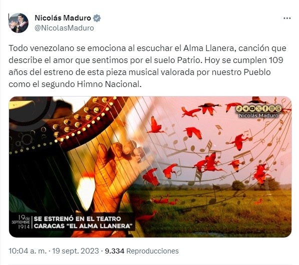 “Todo venezolano se emociona al escuchar el Alma Llanera, canción que describe el amor que sentimos por el suelo Patrio. Hoy se cumplen 109 años del estreno de esta pieza musical valorada por nuestro Pueblo como el segundo Himno Nacional”, expresó el jefe de Estado venezolano.