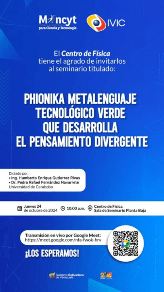 El Instituto Venezolano de Investigaciones Científicas (IVIC), a través de su Centro de Física, ofrecerá el seminario titulado “Phionika: metalenguaje tecnológico verde que desarrolla el pensamiento divergente”.