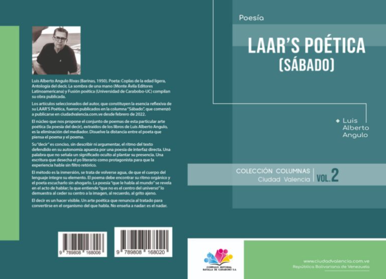 LAAR’S Poética (Complejo Editorial Batalla de Carabobo –CEBAC–, 2026) se presenta como una antología de textos de opinión publicados en el diario digital ciudadvalencia.com.ve, pero en realidad es mucho más que eso: se trata de un campo abierto a la palabra cruzado por sutiles veredas donde el poeta Angulo va dejando rastros acerca de su andar en la literatura.