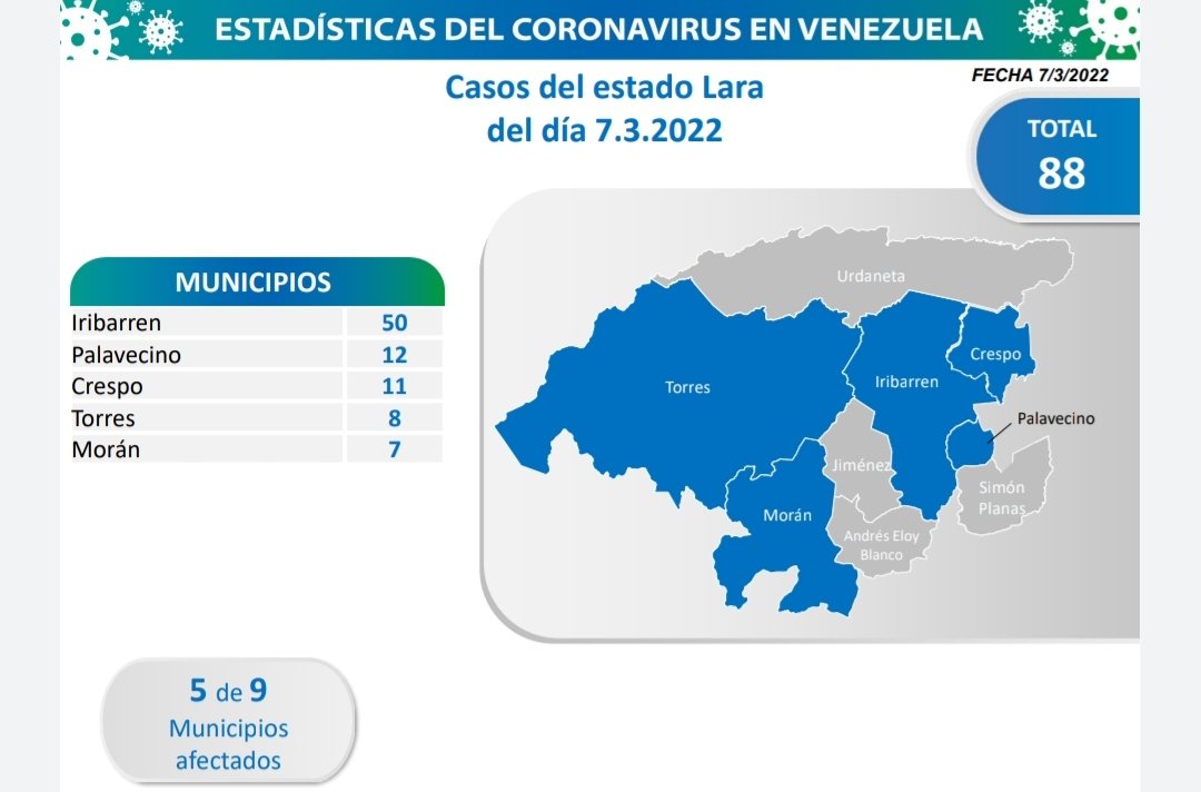 En su mayoría, los casos comunitarios se ubicaron en los siguientes estados: Lara 88 (con repercusión en 5 de sus 9 municipios), Yaracuy 21, Miranda 18, Cojedes 8 y Caracas 7. Los 2 casos importados vienen desde Panamá, con entrada por La Guaira.