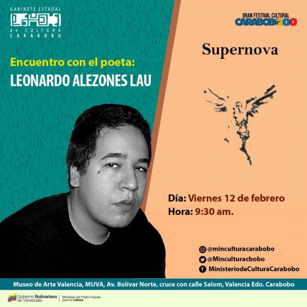Leonardo Alezones Lau es poeta, artista plástico egresado de la Escuela de Artes Arturo Michelena, autor del poemario Arcada (2007), Amalivaca (2012) y la plaquette I.N-R.I (2016), actualmente alterna su trabajo literario con una serie de pinturas digitales y se desempeña como Coordinador de las Escuelas de Arte de la Secretaria de Educación de la Gobernación de Carabobo.