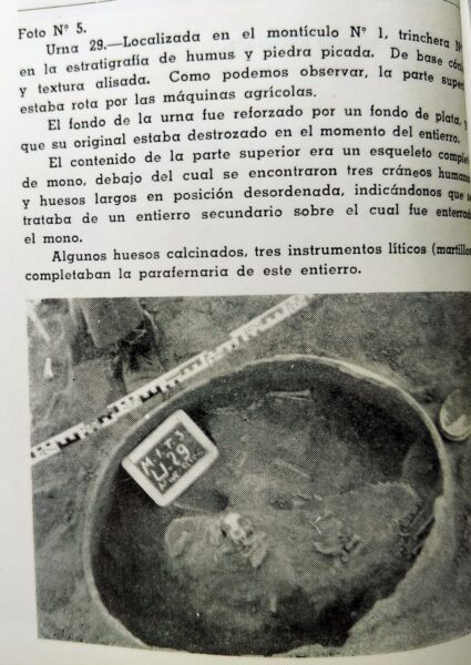 También se hallaron tinajas funerarias con esqueletos de monos sobre restos humanos desordenados, lo que refuerza la hipótesis de entierros secundarios.