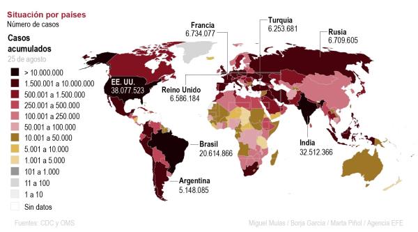 Este domingo se contabilizan a escala global 225.215.218 casos confirmados de Coronavirus, de los cuales 4.640.692 corresponde a personas fallecidas y 201.784.602 a pacientes recuperados, según datos difundidos en el portal Worldometers.info.