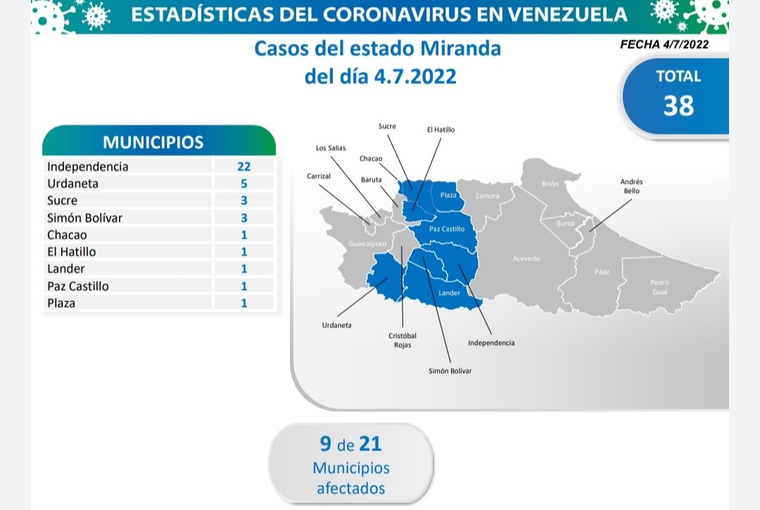 La mayoría de los casos comunitarios se ubicaron en Miranda 38 (contagios en 9 de sus 21 municipios: Independencia 22, Urdaneta 5, Sucre 3, Simón Bolívar 3 y Chacao 1); Caracas 17, Yaracuy 8, La Guaira 2 y Mérida 2.