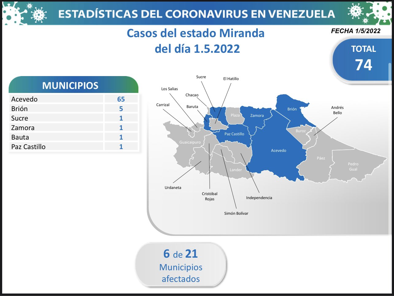 Miranda fue la entidad con más nuevos casos comunitarios (74), con contagios activos en 6 municipios; le siguen Aragua (15), Mérida (11) y Caracas (4).