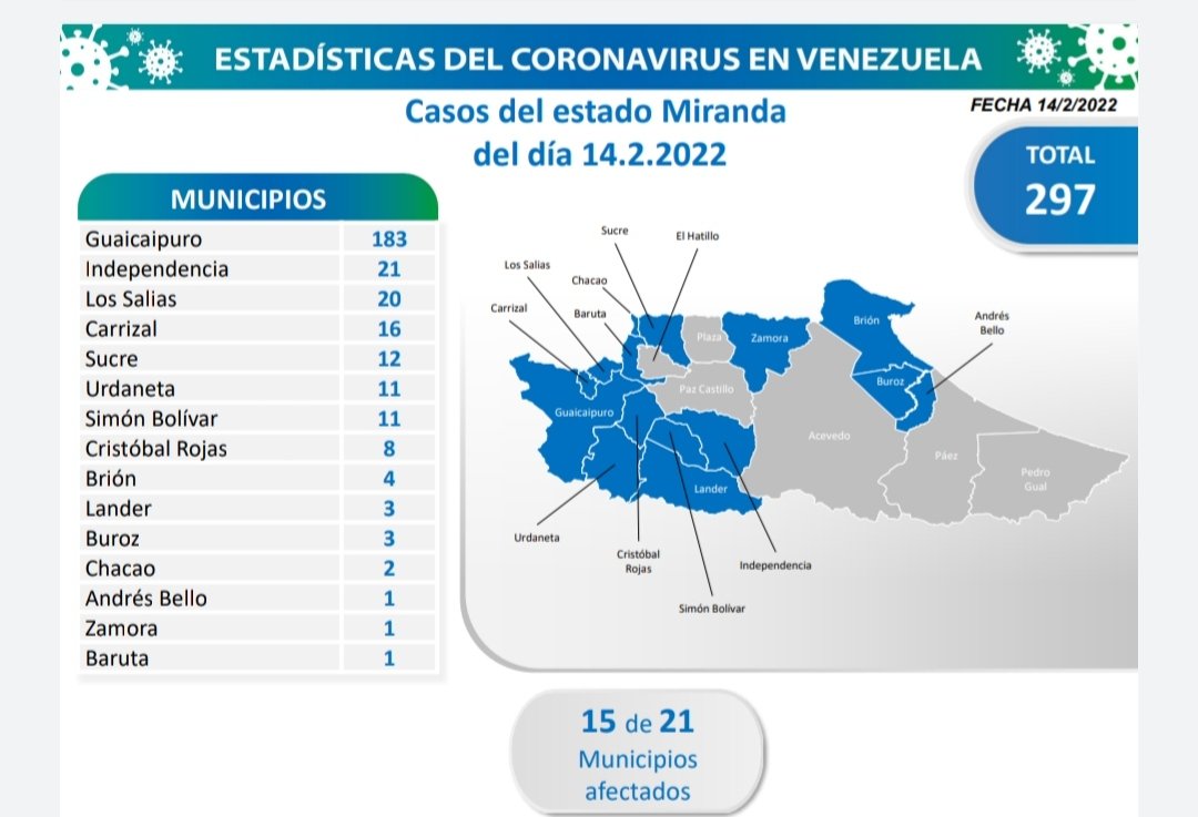 Miranda presenta hoy el mayor número de contagios en 15 de sus 21 municipios: Guaicaipuro 183, Independencia 21, Los Salias 20, Carrizal 16, Sucre 12.