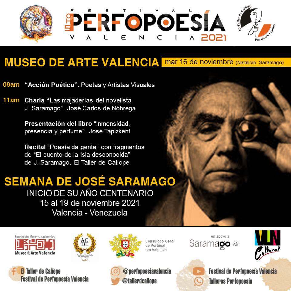 El martes 16 de noviembre, día del Natalicio de José Saramago, será el inicio de la celebración de su año Centenario 2021 – 2022, con una programación variada durante la mañana en el Museo de Arte Valencia (MUVA), en el marco del 5to Festival de Perfopoesía Valencia, que dedicará la Semana de José Saramago al escritor portugués ganador del Premio Nobel.