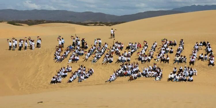 La mandataria encargada de la República Bolivariana de Venezuela, Delcy Rodríguez, se unió este martes a una pizarra humana en los Médanos de Coro para expresar que «Venezuela es paz».