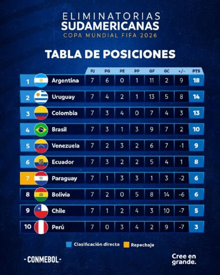 Ante el aumento de plazas para la Copa del Mundo del 2026 a 48 equipos, la Conmebol dispondrá de seis lugares directos y uno más a través de la repechaje intercontinental y de momento así marcha las eliminatorias sudamericanas 2026: