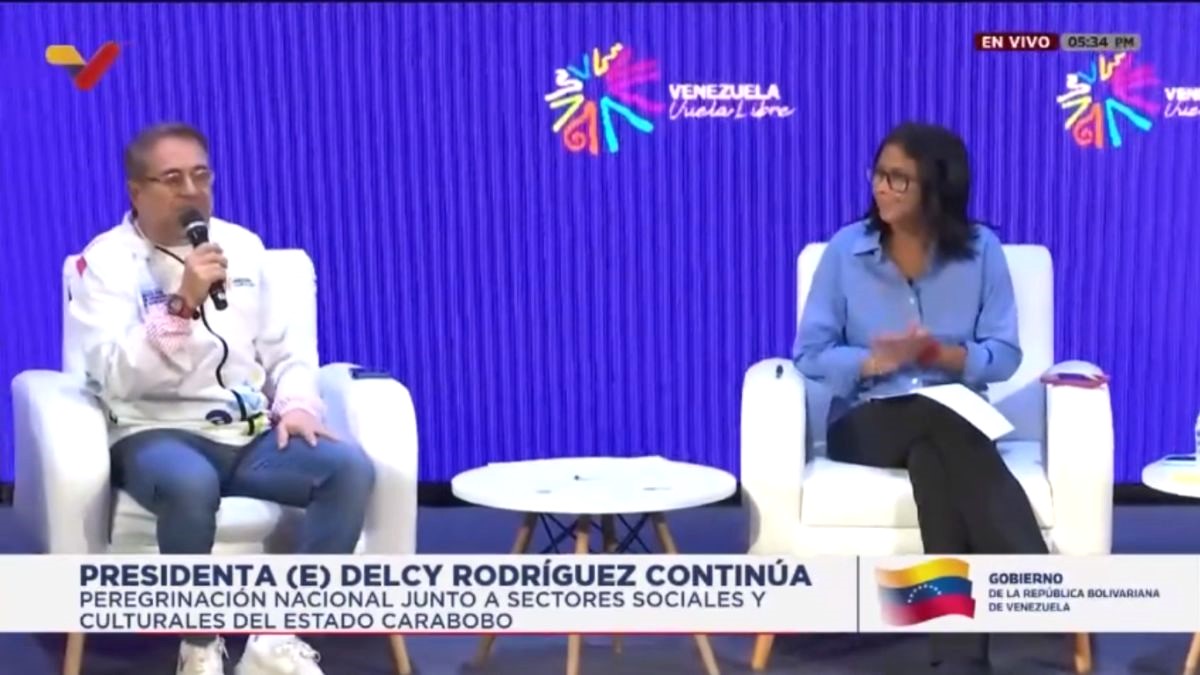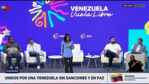 La presidenta encargada de la República, Delcy Rodríguez, encabezó un diálogo con sectores productivos, partidos políticos de oposición y movimientos sociales. en el estado Carabobo, en el marco de la peregrinación por una Venezuela libre de sanciones.