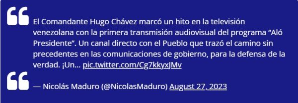 Mediante la red social X (Twitter) @NicolasMaduro, el jefe de Estado manifestó que el líder eterno de la Revolución llevó a cabo “un canal directo con el Pueblo que trazó el camino sin precedentes en las comunicaciones de gobierno, para la defensa de la verdad. ¡Un ejemplo que hoy debemos seguir!