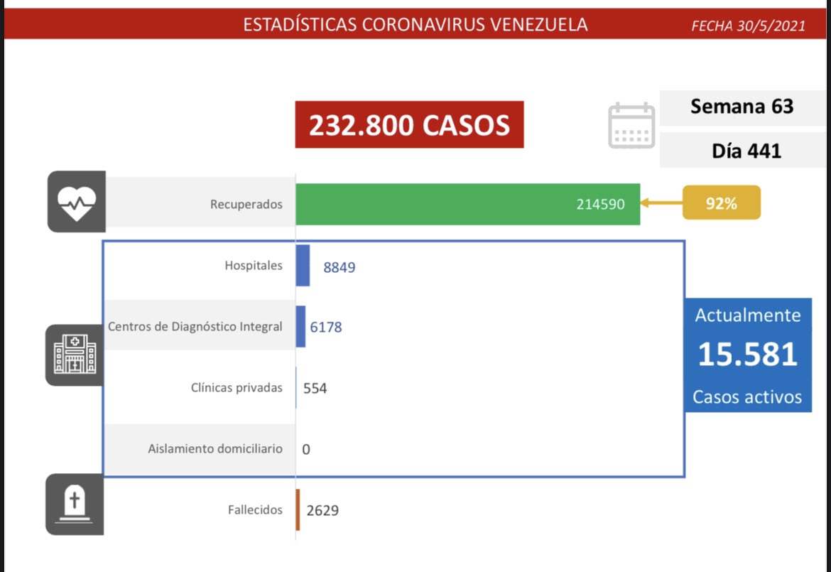 Igualmente Venezuela confirma que las estadísticas generales del virus desde que se decretó la pandemia en el país, en marzo del año pasado son: total de contagios: 232.800; pacientes recuperados: 214.590 (92%); casos activos actuales: 15.581; total de fallecidos: 2.629.