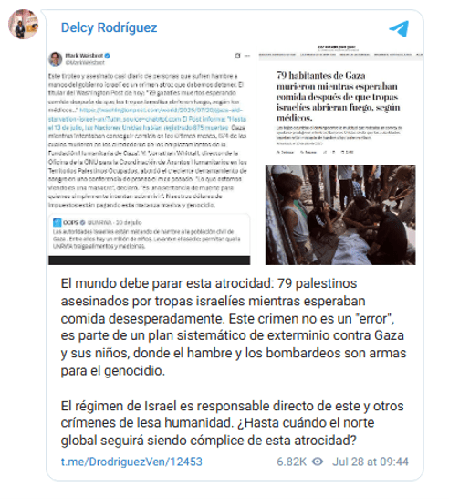 La vicepresidenta Ejecutiva de la República Bolivariana de Venezuela, Delcy Rodríguez, afirmó: «el mundo debe parar la atrocidad que viene cometiendo el régimen sionista en Gaza«, tras el fallecimiento de 79 palestinos asesinados por tropas israelíes mientras esperaban comida desesperadamente.
