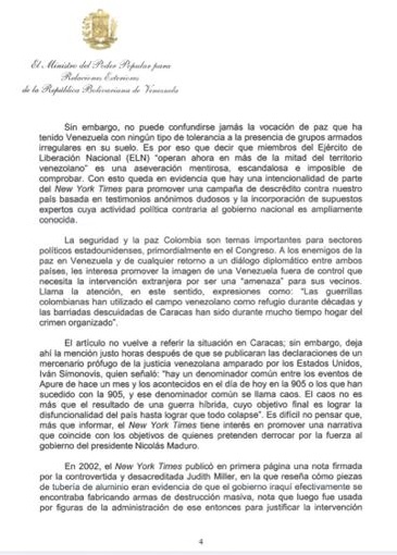 La misiva a la que hace referencia el diplomático venezolano critica la postura del diario nortemaricano, en un artículo publicado el pasado 26 de abril bajo el título «Grupos terroristas se instalan en Venezuela mientras crece la anarquía».