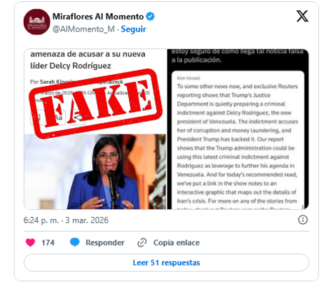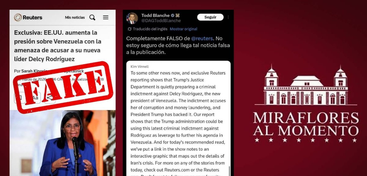 El Gobierno de Venezuela, a través de la cuenta en la red social X, Miraflores Al Momento, desmintió la noche de este martes 3 de marzo un fake news difundido por la agencia Reuters contra la presidenta encargada de la República, Delcy Rodríguez.