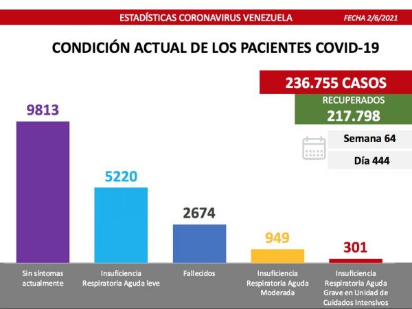 Venezuela mantiene combate al covid-19: registra 1.188 casos de transmisión comunitaria todos detectados en las últimas 24 horas por las autoridades sanitarias. Así que el acumulado de contagios, en 14 meses de pandemia se ubica en 236.755. Con estos números se mantiene la tasa de recuperación en 92 por ciento del total de casos al registrarse 217.798 pacientes curados. Esta recuperación se logra gracias a los tratamientos gratuitos que garantiza el Gobierno Bolivariano.