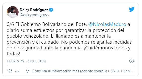 Así lo dio a conocer este sábado la Vicepresidenta Ejecutiva de la República, Delcy Rodríguez, durante el acostumbrado balance diario que ofrece la Comisión Presidencial para el Control y la Prevención de la COVID-19, a través de su cuenta en la red social @delcyrodriguezv.
