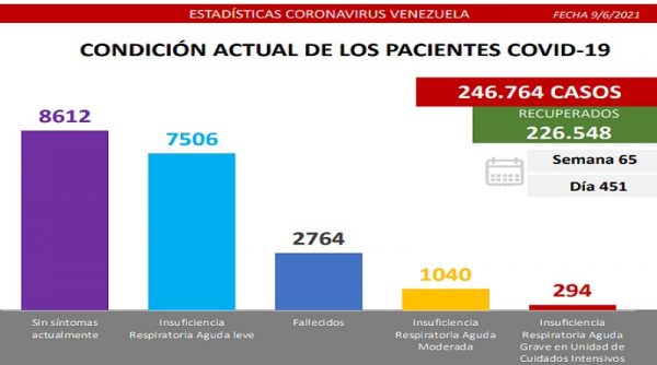 Venezuela registra un total de 1.464 casos de transmisión comunitaria de covid-19, todos detectados en las últimas 24 horas por las autoridades sanitarias venezolanas. Con esta cifra se llega a un acumulado, en 14 meses de pandemia, de 246.764 casos positivos y un total de 226.548 recuperados. Es decir que la tasa de curación es de 92 por ciento. Porcentaje que se alcanza gracias a los tratamientos gratuitos que garantiza el Gobierno Bolivariano.