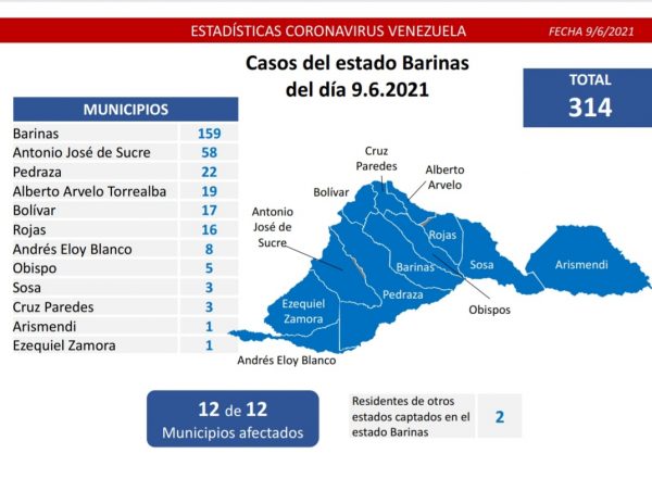 Asimismo, precisa que el estado Barinas es la entidad con mayor número de contagios en sus 12 municipios con 314 casos: Barinas (159), Antonio José de Sucre (58), Pedraza (22), Alberto Arvelo Torrealba (19), Bolívar (17), Rojas (16), Andrés Eloy Blanco (8), Obispo (5), Sosa (3), Cruz Paredes (3), Arismendi (1) y Ezequiel Zamora (1):