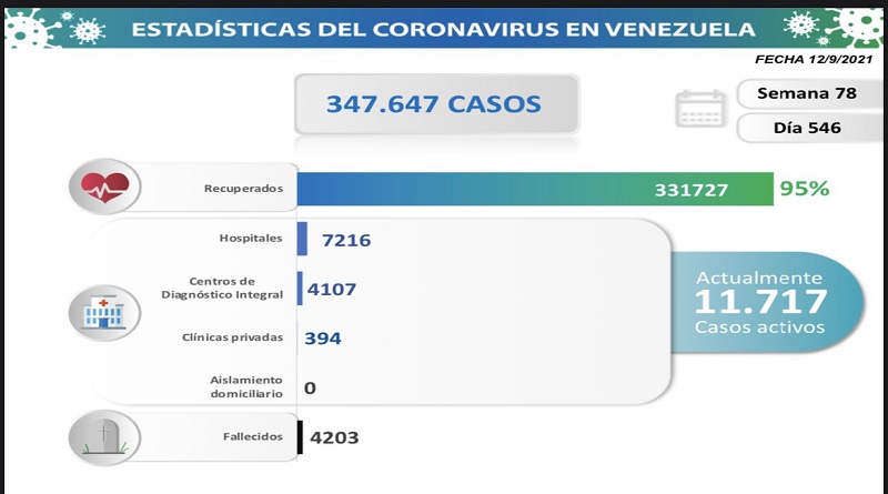 Con ello se registran 347.647 casos acumulados a la fecha, mientras que la tasa de recuperados es de 95%, al sumar 331 mil 727 pacientes sanados, gracias a los tratamientos gratuitos que garantiza el Gobierno Revolucionario Bolivariano.