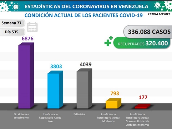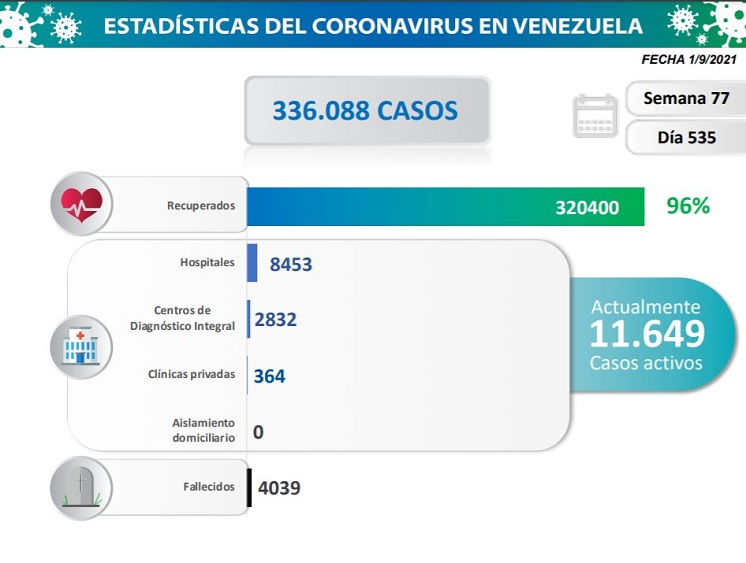 Llegamos a un total de 336.088 casos confirmados, 320.400 personas recuperadas, lo que representa el 96% de los contagios. Contamos con 11.649 casos activos, 11.285 que están siendo atendidos en el sistema público de salud y 364 son atendidos en clínicas privadas.