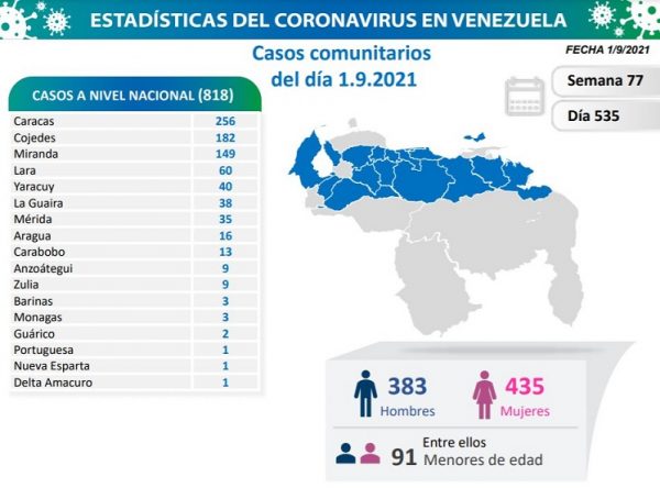 Los casos comunitarios están ubicados en los siguientes estados: Caracas 256, Cojedes 182, Miranda 149, Lara 60, Yaracuy 40, La Guaria 38, Mérida 35, Aragua 16, Carabobo 13, Anzoátegui y Zulia 9, Barinas y Monagas 3, Guárico 2 y, Portuguesa, Nueva Esparta y Delta Amacuro con 1 caso.