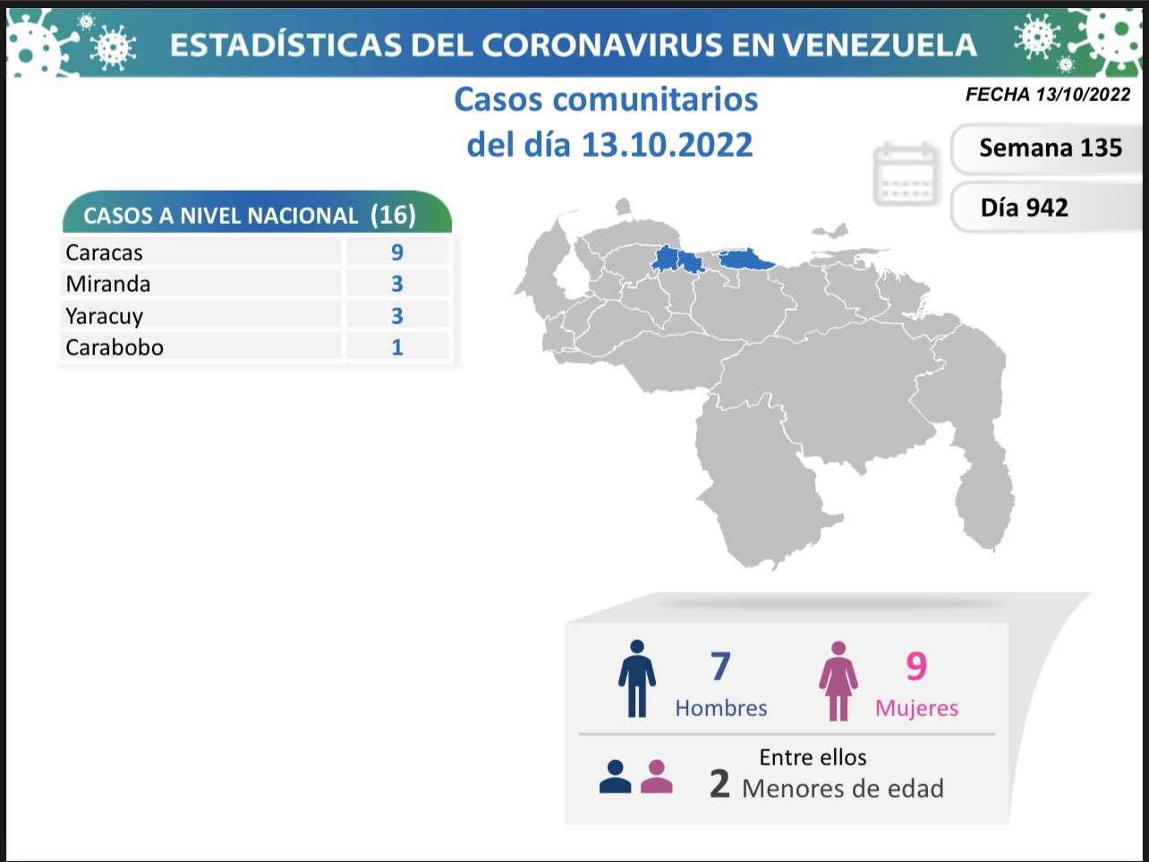 Venezuela registró 16 nuevos contagios de Covid-19 en las últimas horas, todos ellos por transmisión comunitaria, sin fallecidos, informó la vicepresidenta Ejecutiva de la República, Delcy Rodríguez, a través de su cuenta oficial en la red social Twitter.
