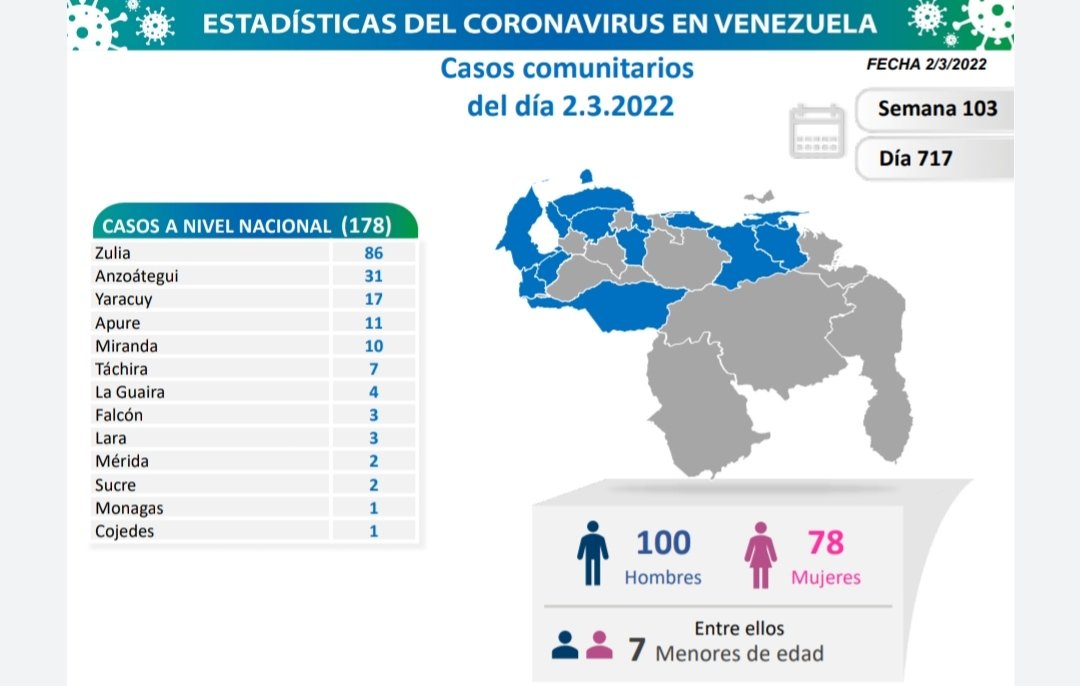En su mayoría, los casos comunitarios se ubicaron en los siguientes estados: Zulia 86, Anzoátegui 31, Yaracuy 17, Apure 11 y Miranda 10. Los 2 casos importados vienen desde Panamá, con entrada por La Guaira.