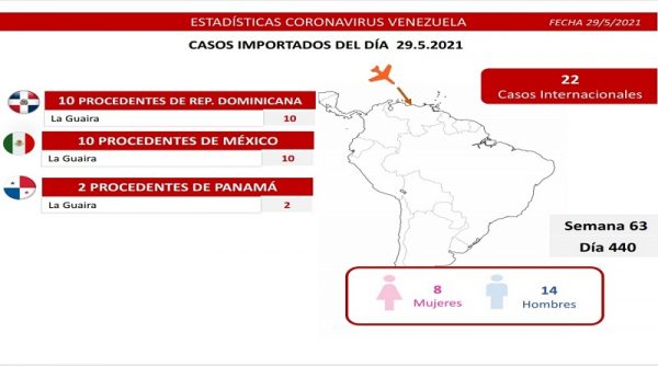 De los casos importados, 10 proceden de México, 10 de República Dominicana, y 02 de Panamá, todos con entrada por el estado La Guaira.