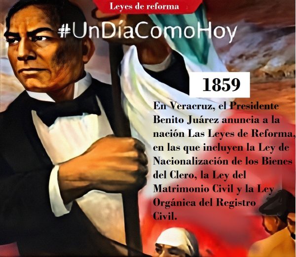 1859: En México, el presidente Benito Juárez declara propiedad nacional todos los bienes de la Iglesia católica.