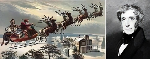En el poema le coloca el trineo con ocho renos nombrándolos: Saltarín, Bailarín, Gruñón, Cupido, Vanidoso, Trueno, Relámpago y Cometa; también lo pone entrando por la chimenea para traer los regalos. Es descrito como un regordete parecido a un elfo, copiando al gnomo Tomten de Escandinavia. El cuento toma el nuevo nombre de «Fue la noche antes de navidad«